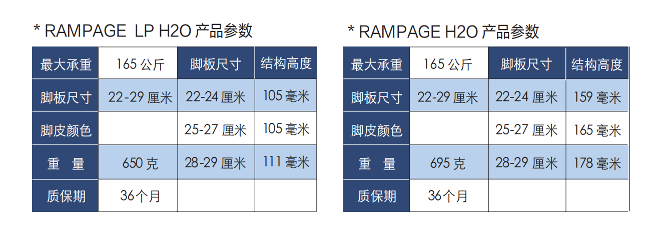 防水系列涵盖了ROGUE、RAMPAGE、RAMPAGE LP、这三款脚板,也就是说这三款脚板即可选择普通型,也可以选择防水型。